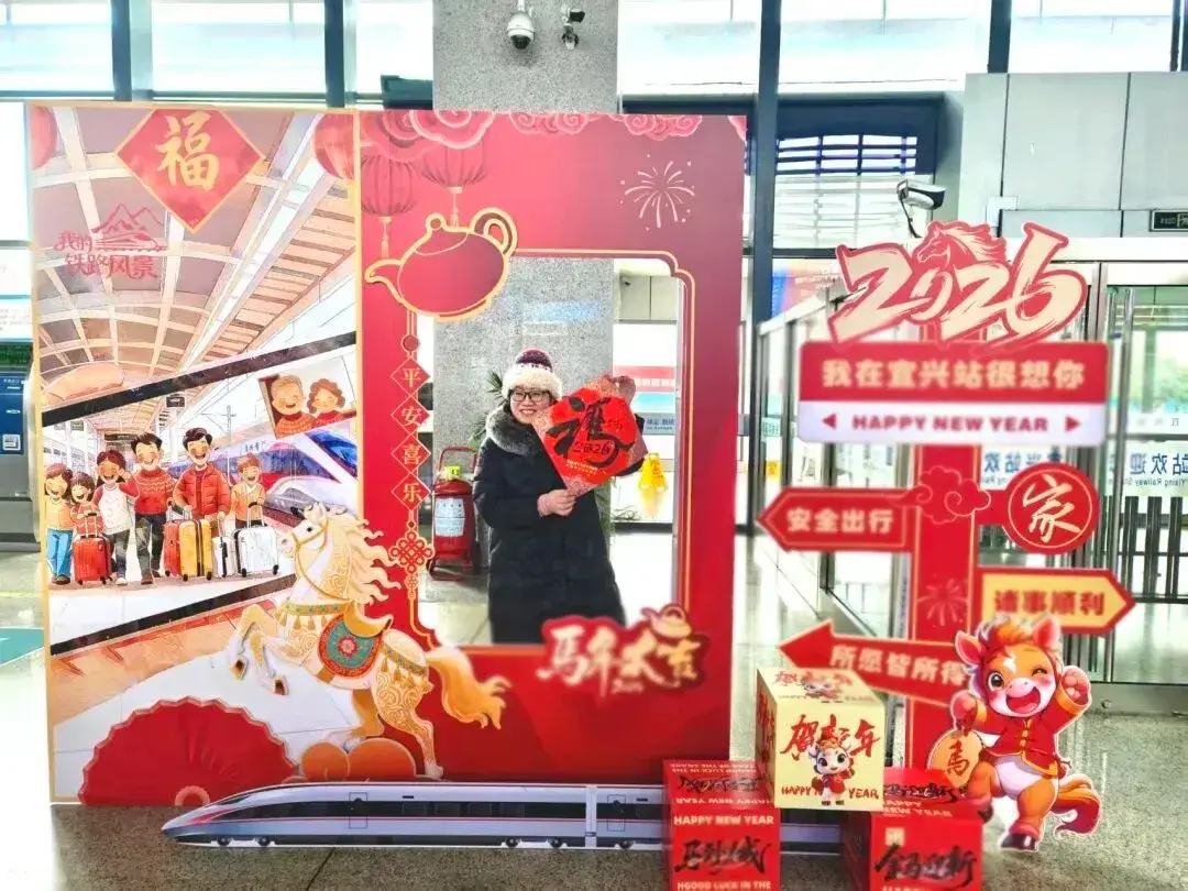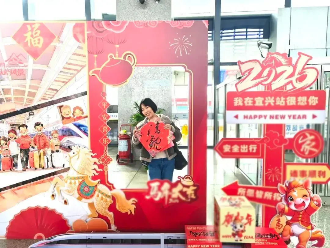 旅客在宜兴高铁站拿着福字拍照打卡。 央视新闻网友@神仙圣