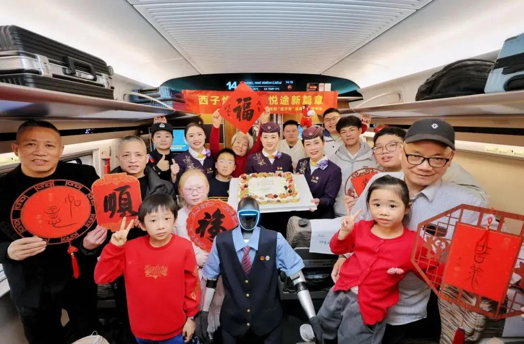 旅客在G41次高铁上与机器人及乘务员合影。 央视新闻网友@东方匀