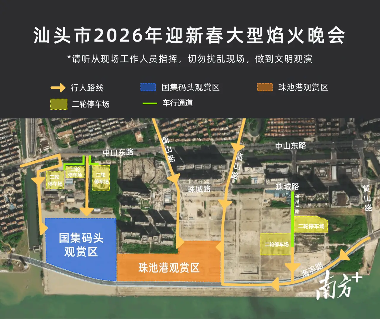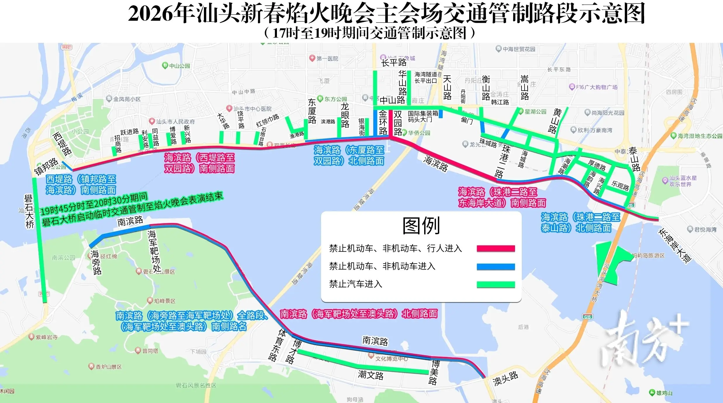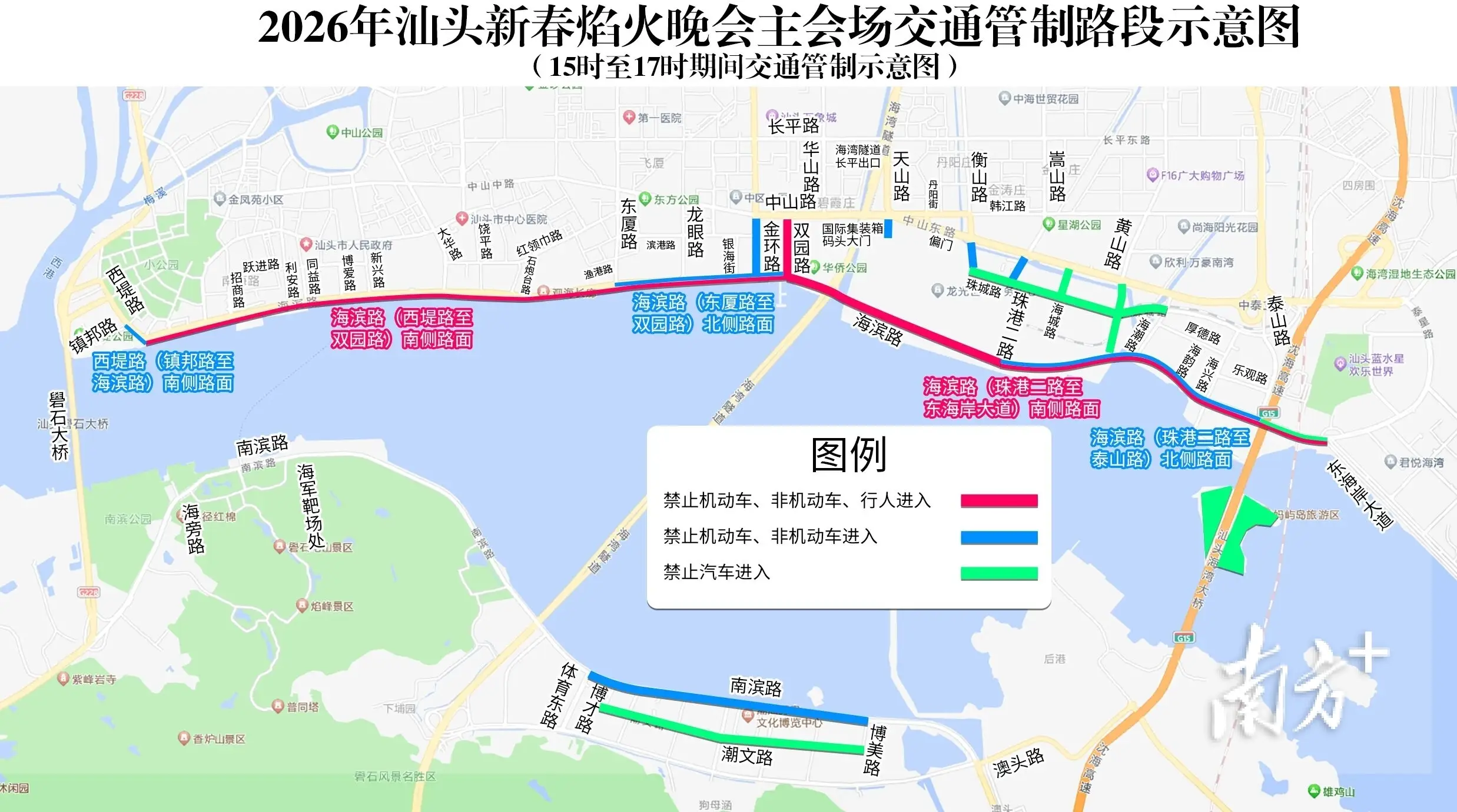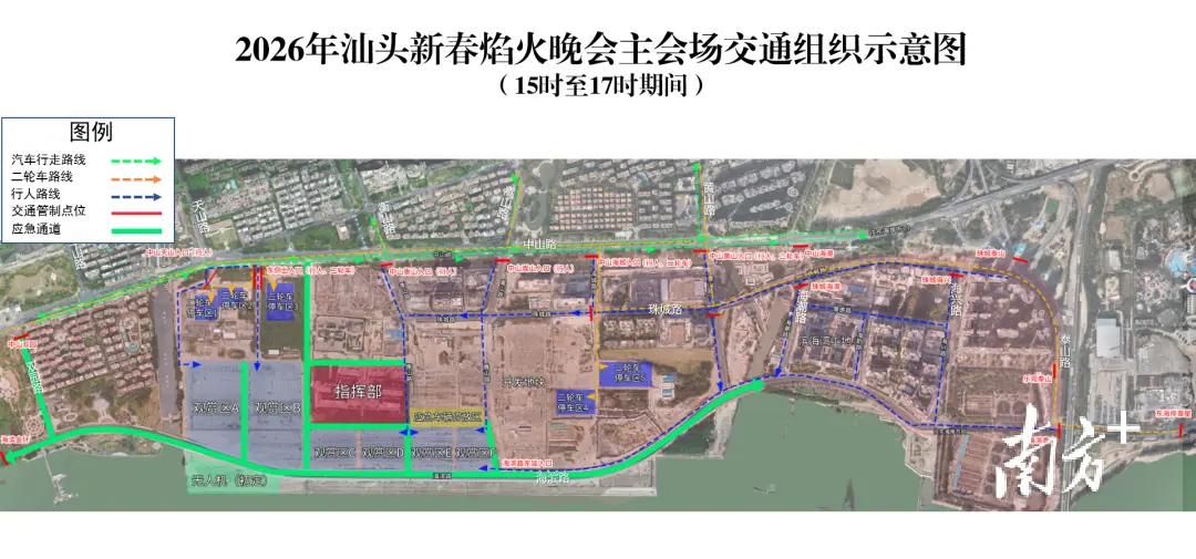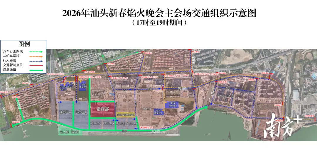 2月18日(正月初二)晚8时,“马汕有好事”汕头市2026年迎新春大型焰火晚会将在国际集装箱码头周边及对开海面举行。届时,市民游客如何进入观赏区?车停哪里?汕头市2026年迎新春大型焰火晚会指挥部办公室精心整理了一份出行攻略,为市民游客提供便利。 交通管制路段 为确保焰火晚会期间道路交通安全,公安交管部门将对以下路段实行全封闭临时交通管制: 一、根据路面交通流量情况,2026年2月18日15时至17时期间,对以下区域(道路)启动临时交通管制到活动结束: