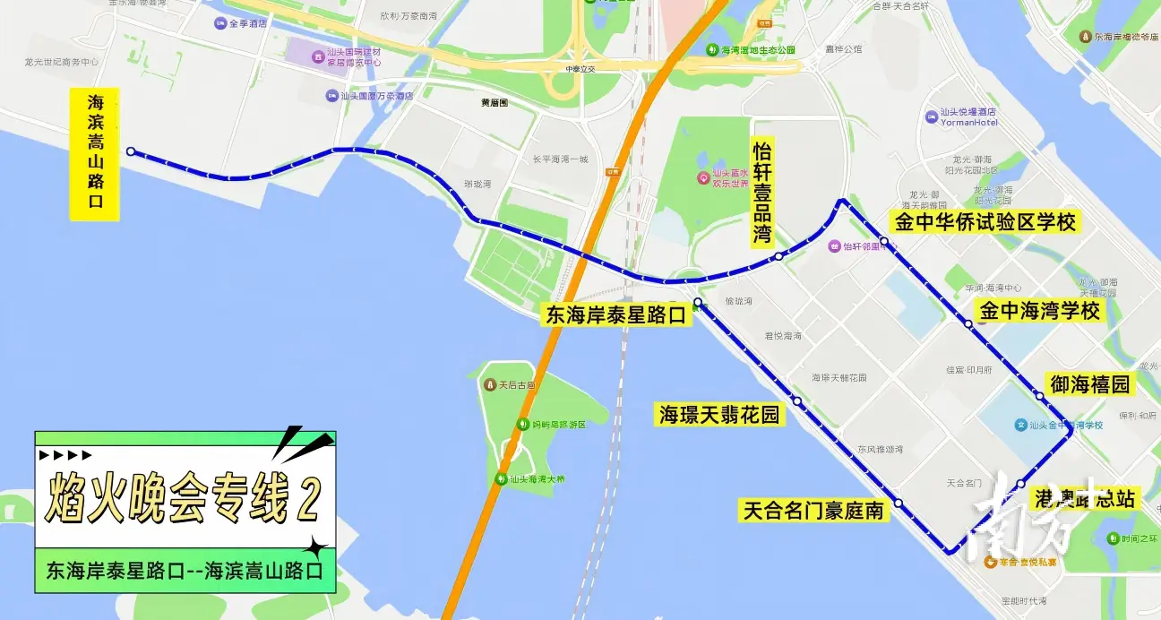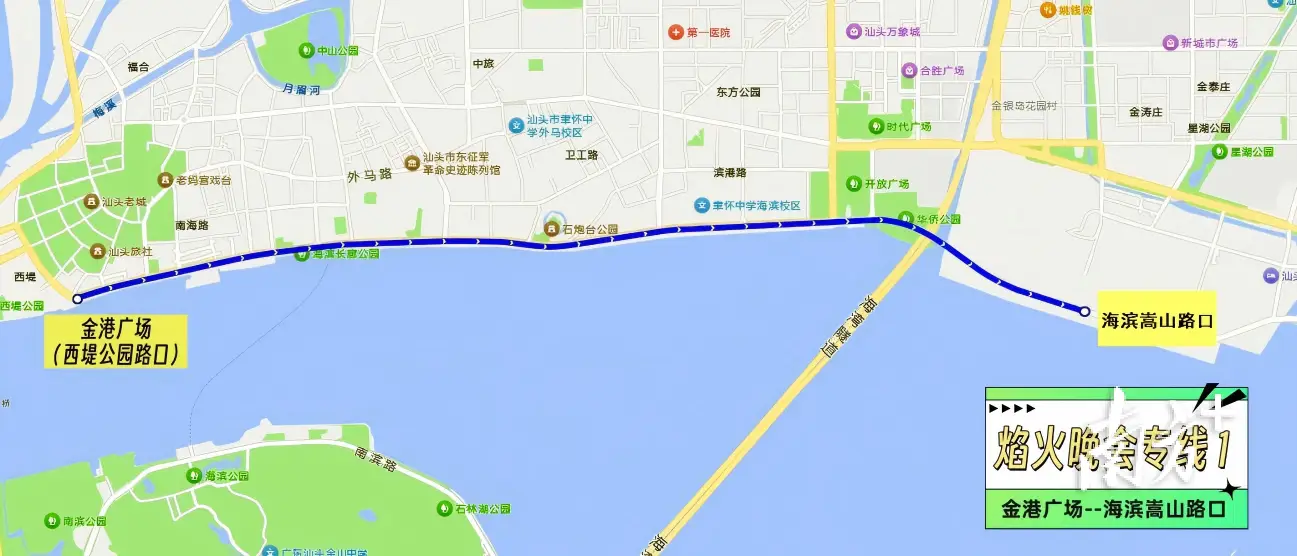 公交接驳出行指引 本次晚会开设3条公交接驳专线,并结合汕头站现有公交线路保障市民群众前往焰火晚会周边: 1.西堤公园接驳专线 运行时间:晚会当天17:00-19:30;晚会结束后,接驳观众返程。 线路走向:金港广场公交站-海滨路-海滨嵩山路口。 中途停靠站点:中途不设停靠站点,采取直达模式运行。
