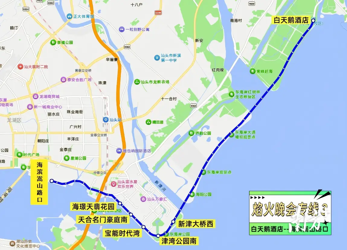 2.东海岸新津片区接驳专线 运行时间:晚会当天17:00-19:30;晚会结束后,接驳观众返程。 线路走向:东海岸大道泰星路口-东海岸大道-港澳路-阿里山路-泰星路-海滨路-海滨嵩山路口。 中途停靠站点:海璟天翡花园公交站、天合名门豪庭南公交站、港澳路总站公交站、御海禧园(东)公交站、金中海湾学校公交站、金中华侨试验区学校公交站、怡轩壹品湾公交站。