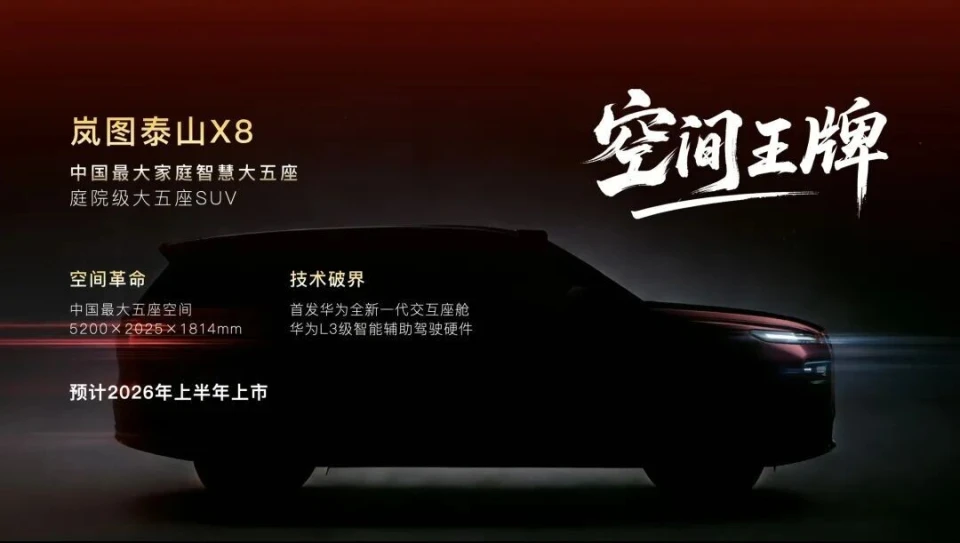 或许是因为看到2025年的大六座大型SUV市场竞争格外激烈,也可能是因为看到同行们都在推出自家大型旗舰SUV的衍生车型。马上,岚图汽车也将要推出一款庭院级大五座SUV——泰山X8。按照官方说法,泰山X8会是中国最大家庭智慧大五座SUV,定语加得挺多,不知车到底怎么样。