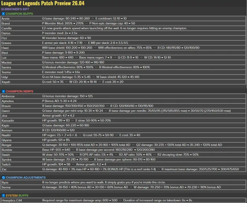 设计师Matt发布了26.4版本的改动总览,国服由于新年放假,预计在3月5日和26.5版本合并更新。