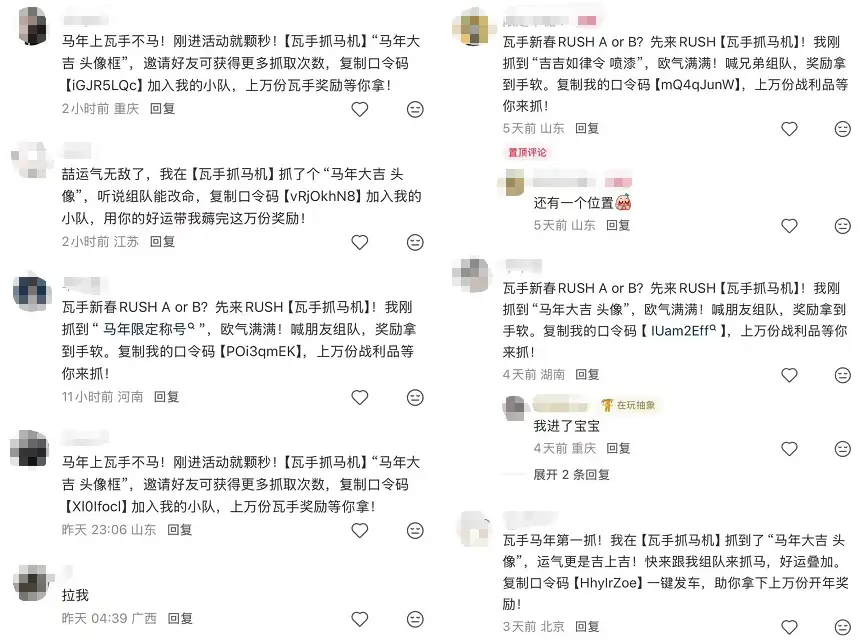 “马年上瓦手不马”。 这个春节,互联网上的年轻用户间开始流传着这样一句“口号”。既像是一种祝福,也像是暗号,在游戏群、朋友圈、评论区、社交平台中反复出现。 从学生党到职场人,这句玩梗口号直接让《无畏契约:源能行动》(下称“瓦手”)成为马年春节最具话题度的手游之一。