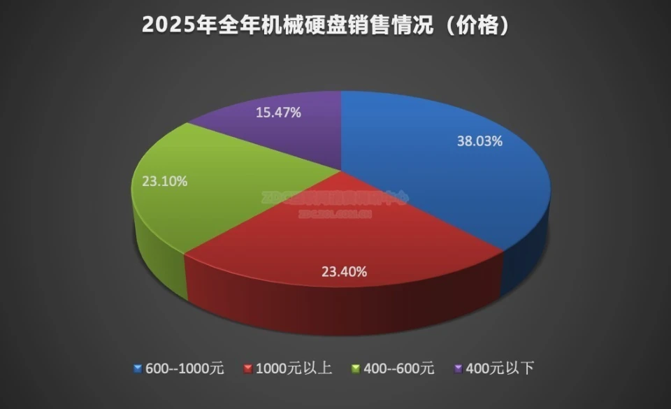 3 NAS当道 大容量的机械硬盘依然受热捧 虽然固态硬盘已经全面普及,但各类成品NAS和网友DIY NAS的普及,高容量的机械硬盘的销量反而上升,而且随着固态硬盘的涨价,身价也水涨船高。从2025年的销量数据来看,600--1000元和1000元以上的价位的产品是市场主流,分别为38.03%和23.4%,而400元以下的小容量产品销量仅占13.2%。